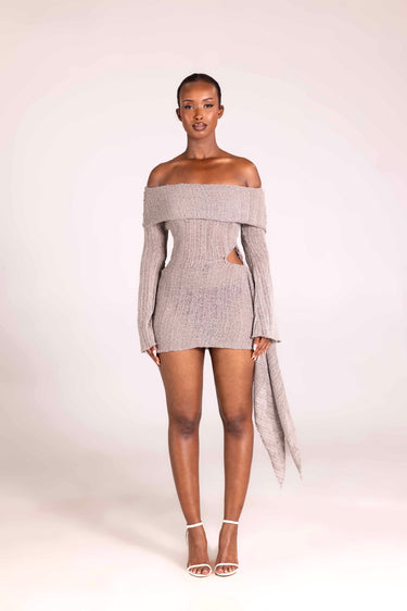 Crafted from a lightweight, stretch-knit fabric, this long sleeve dress features a fold-over neckline, hip-baring cut-out, and asymmetric draped tie detail that sets the tone for effortless seduction. Subtle distressing gives it that undone feel—like you just threw it on and still stole the show.