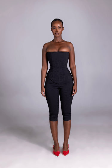 This strapless corset mini features a structured bodice and subtle pinstripe detailing for a tailored feel. Paired with matching capri-length bottoms, , it’s a bold take on modern suiting—sexy, sharp, and unapologetically confident.